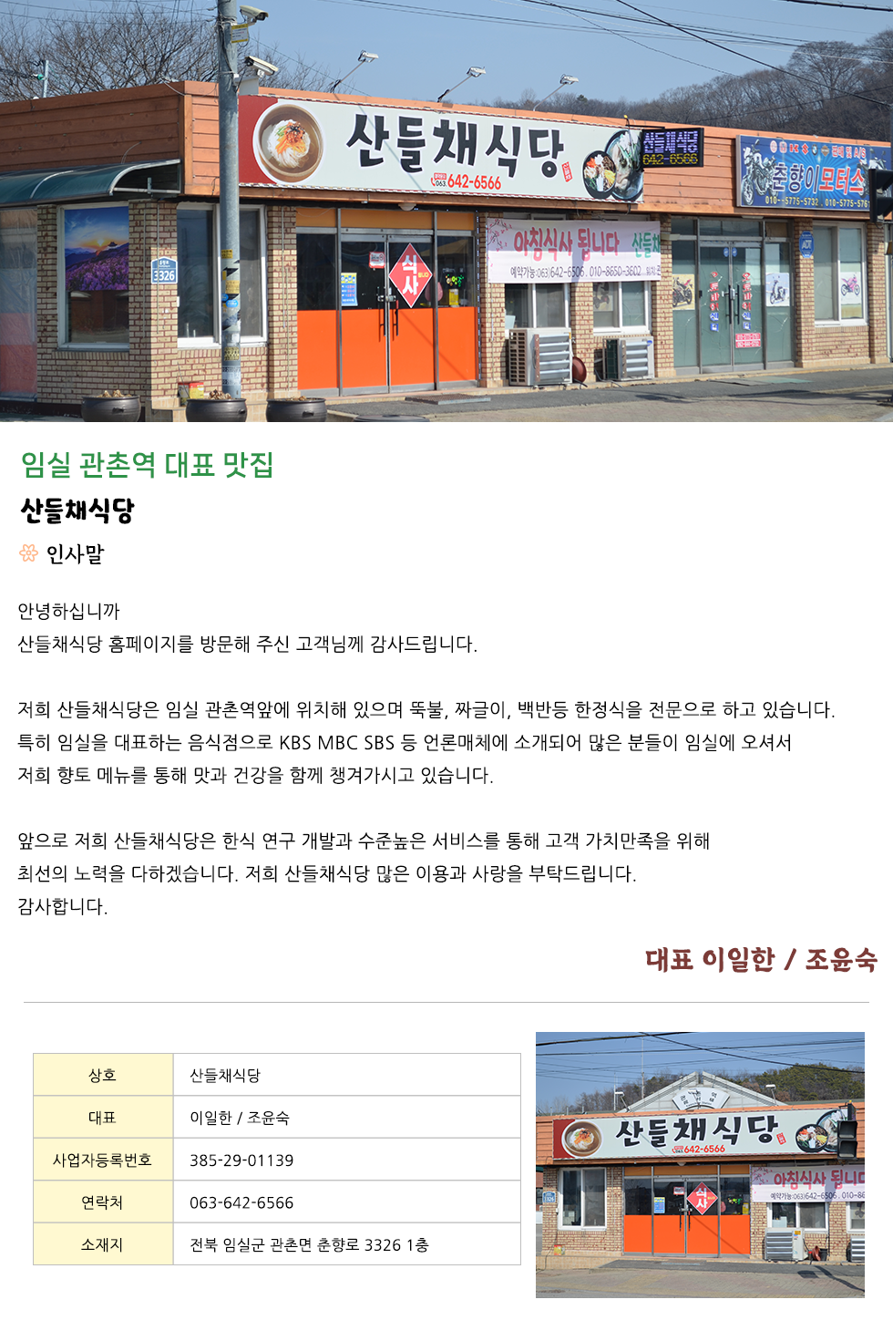 • 산들채식당 | 대표 : 이일한 조윤숙 | 사업자등록번호 : 385-29-01139 | 연락처 : 063-642-6566 | 소재지 : 전북 임실군 관촌면 춘향로 3326 1층